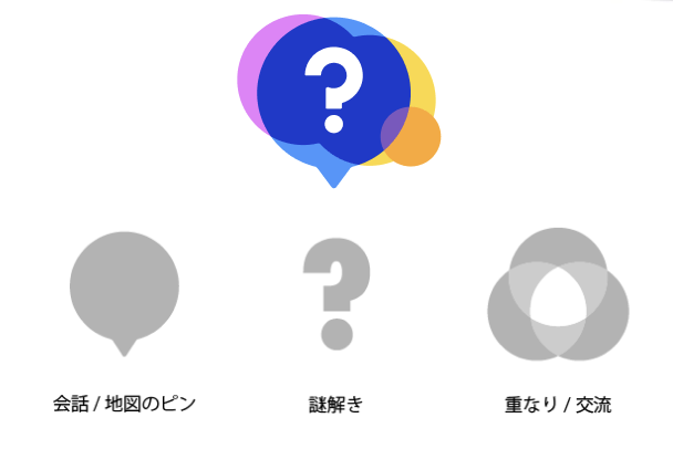 ナゾヒロバのロゴは、カラフルな吹き出しと疑問符のデザインで構成されています。これは「会話/地図のピン」「謎解き」「重なり/交流」という3つの要素を視覚的に表現しています。
